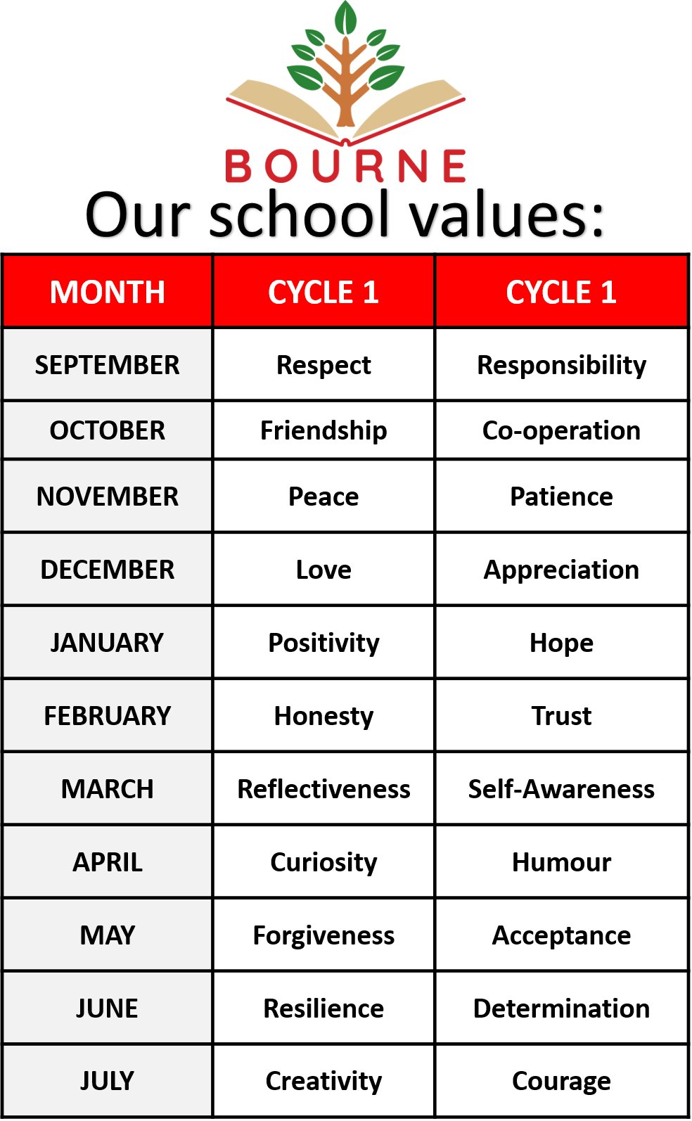 At Bourne we focus on a set of shared values which help us to work with one another co-operatively and with respect. We learn the importance of friendship and unity, and how to approach life with positivity and hope. These values make our school community happy and harmonious, a fun place, where children feel secure. Our Values are important to all pupils, staff and parents. The whole staff team and all pupils are involved in promoting values and recognising their positive effects around school. The values have been selected by pupils and staff as values which are important within the school community and which will be important throughout life.